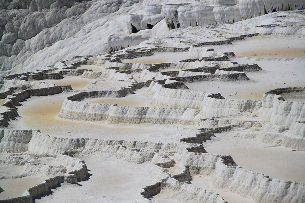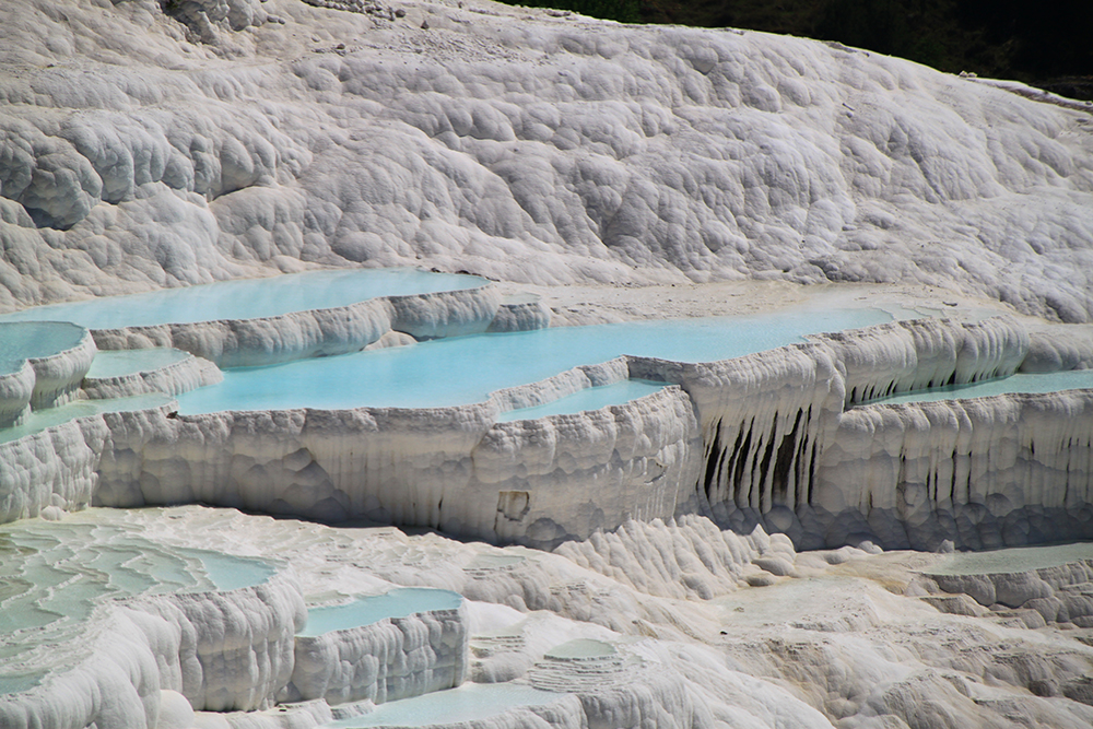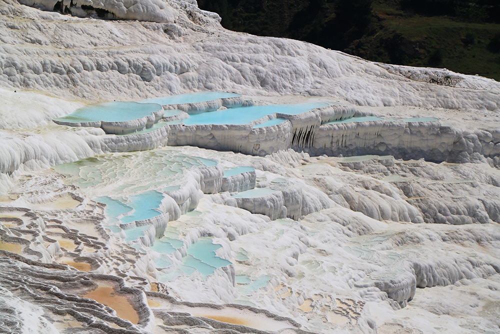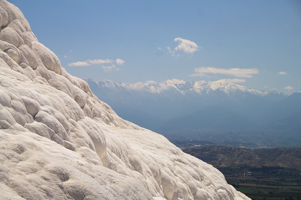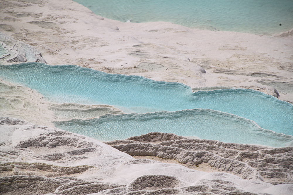 Мы очень удачно втиснулись в погодные рамки: в субботу был 8-балльный шторм, в понедельник было пасмурно, а в воскресенье очень удачно светило солнце, причем прогноз погоды был весьма точен и за 5 дней не изменился. В пасмурную погоду на травертиновых террасах совсем не такие красивые виды, нужно солнце.