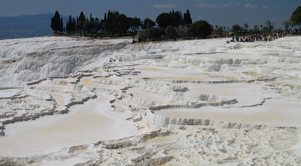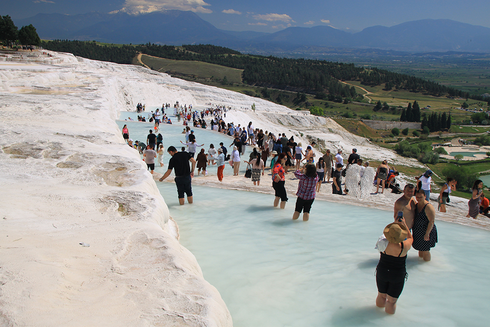 Ответов два: тут всегда теплые бассейны и тут стоят те, кто не любят ходить ногами. Таких 95 процентов посетителей. Еще можно было бы сказать, что сюда сгружают экскурсантов, у которых есть какой-то жалкий час на посещение террас. Но в апреле таких довольно мало, еще не сезон. Большинство посетителей турки. В общем, не стоит там стоять, основная красота не там.