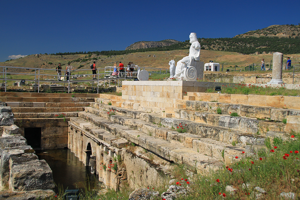 Скульптуры, конечно, копии. Уж больно свеженькие на вид, да и на информационных стендах рассказывается, как их копировали с оригиналов. И Аида, и его Цербера, и двух змеек. Мне очень нравится, что из храма вытекает подземный термальный источник. Вода пузырится, у нее тот же эффект шампанского, что в источнике Клеопатры. И вообще они очень близко друг от друга, наверняка сообщаются между собой.