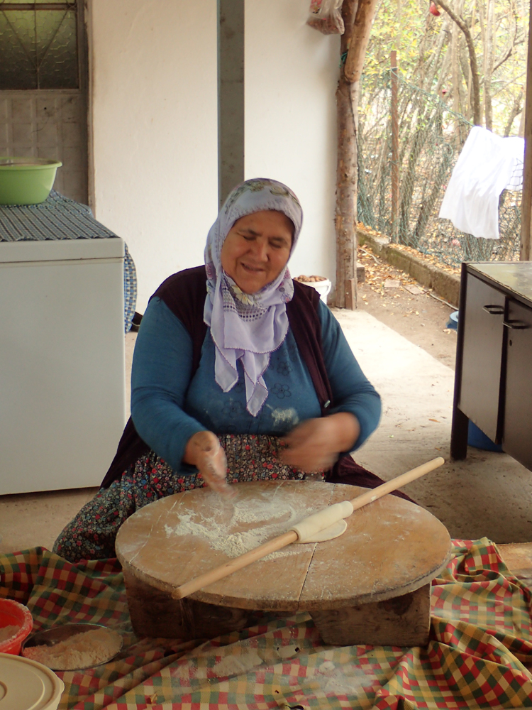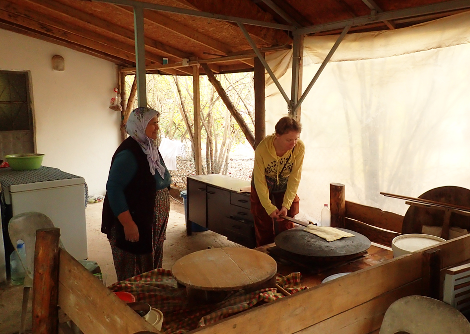 По самому поселку еще довольно долго идти, везде растут апельсины. Нашла на задворках какое-то кафе заброшенного вида, возле которого был прилавок с соковыжималкой и фруктами. Сперва мне сделали гранатового сока, а потом предложили гёзлеме. Поскольку ноги устали, я решила, что сооружение лепешки в реальном времени как раз позволит ногам отдохнуть.