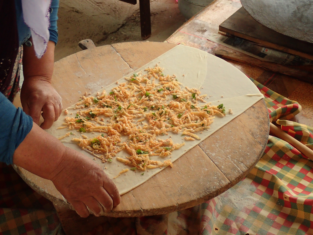 Бабуля начала делать тесто с нуля, раскатав его до тончайшего состояния.