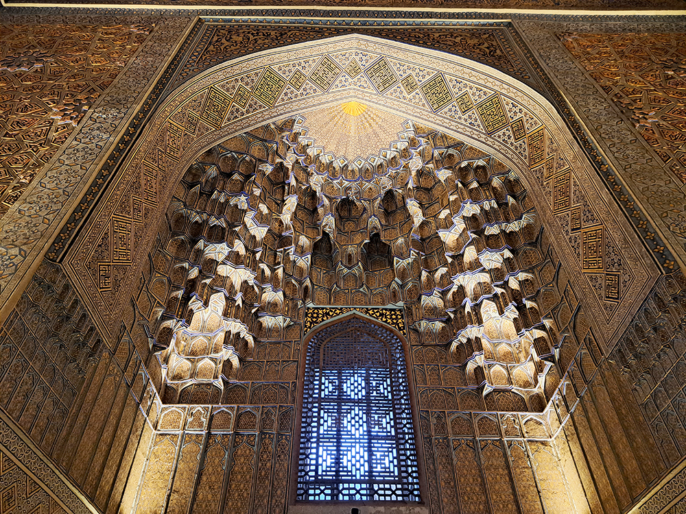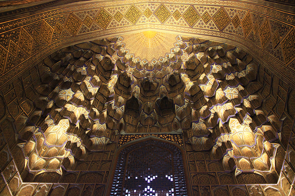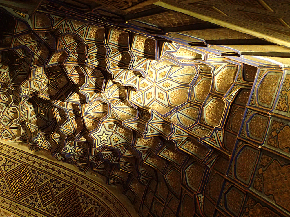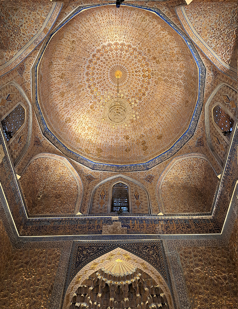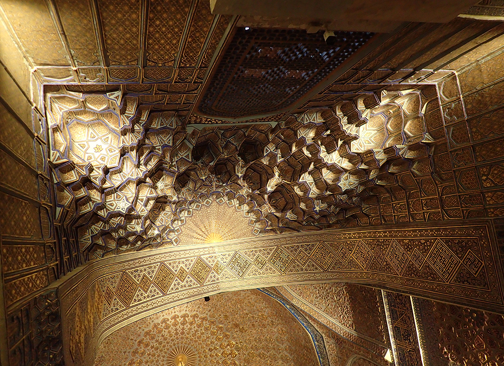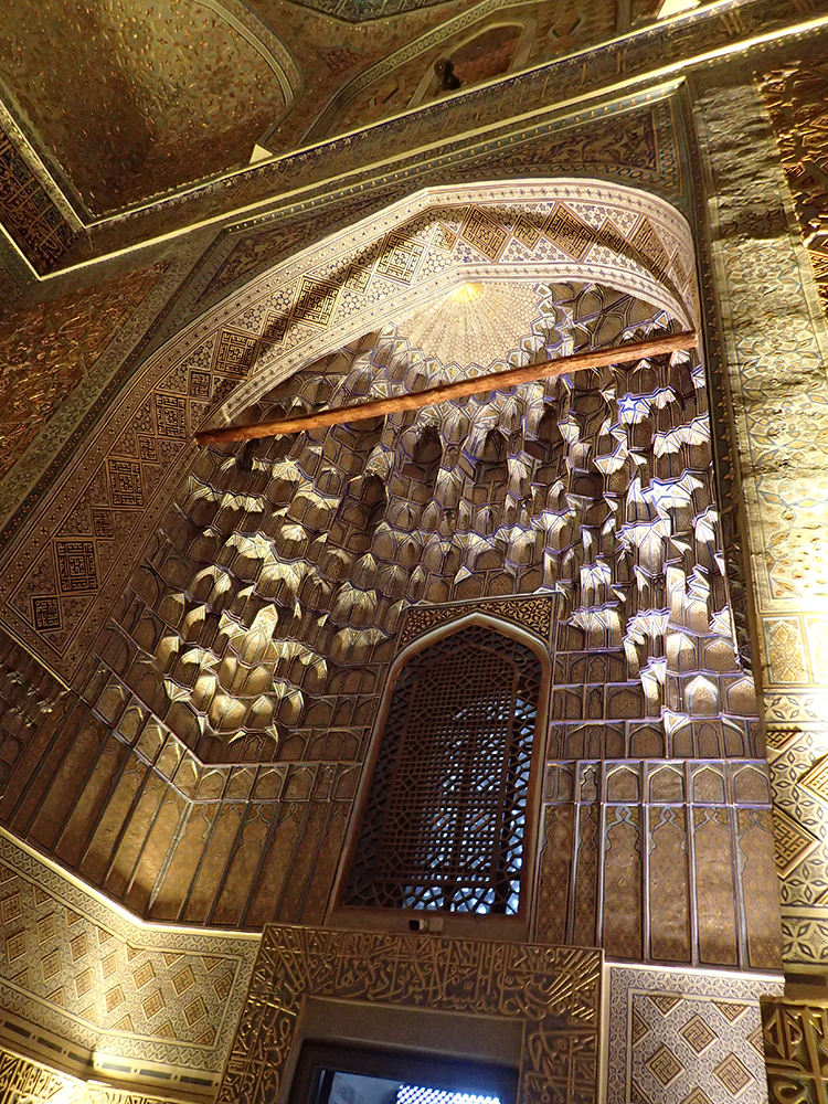 В мавзолее прекрасное внутреннее убранство, золотое с зеленовато-синим.