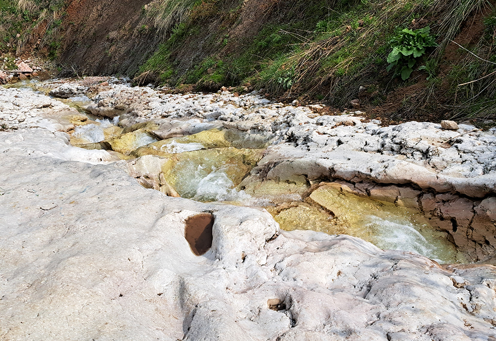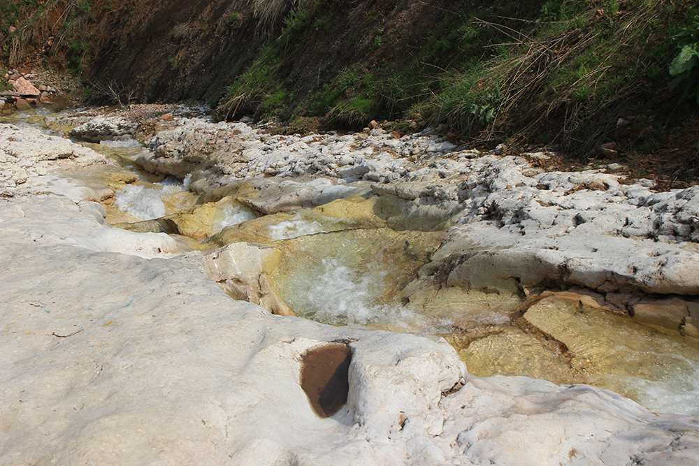 Мраморная речка. Названа там потому, что кое-где глина из русла вымыта и остались белые породы, напоминающие мрамор.