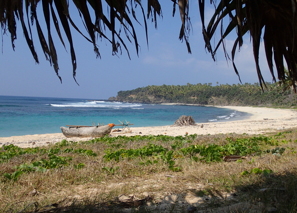 На пляже то и дело попадаются люди, занятые промыслом. В море (то есть в океан :-) выходят на долбленках с балансиром.