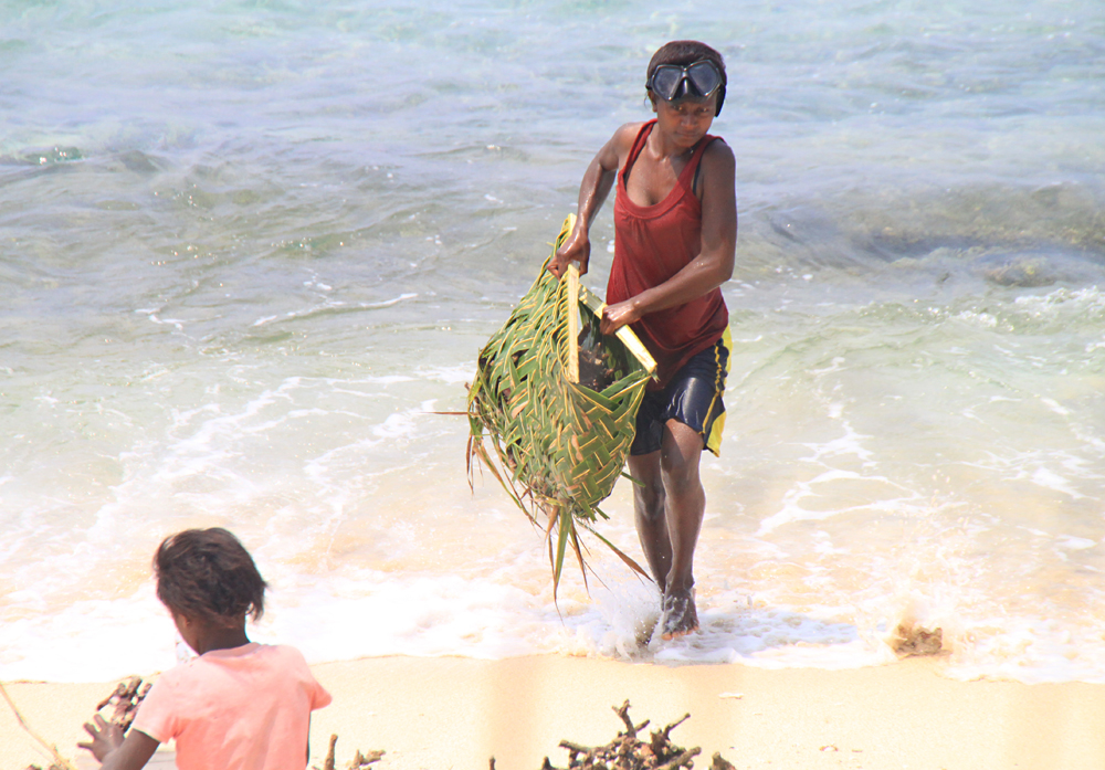 У женщин свои промыслы. Они собирают в океане какие-то съедобные водоросли или части кораллов.