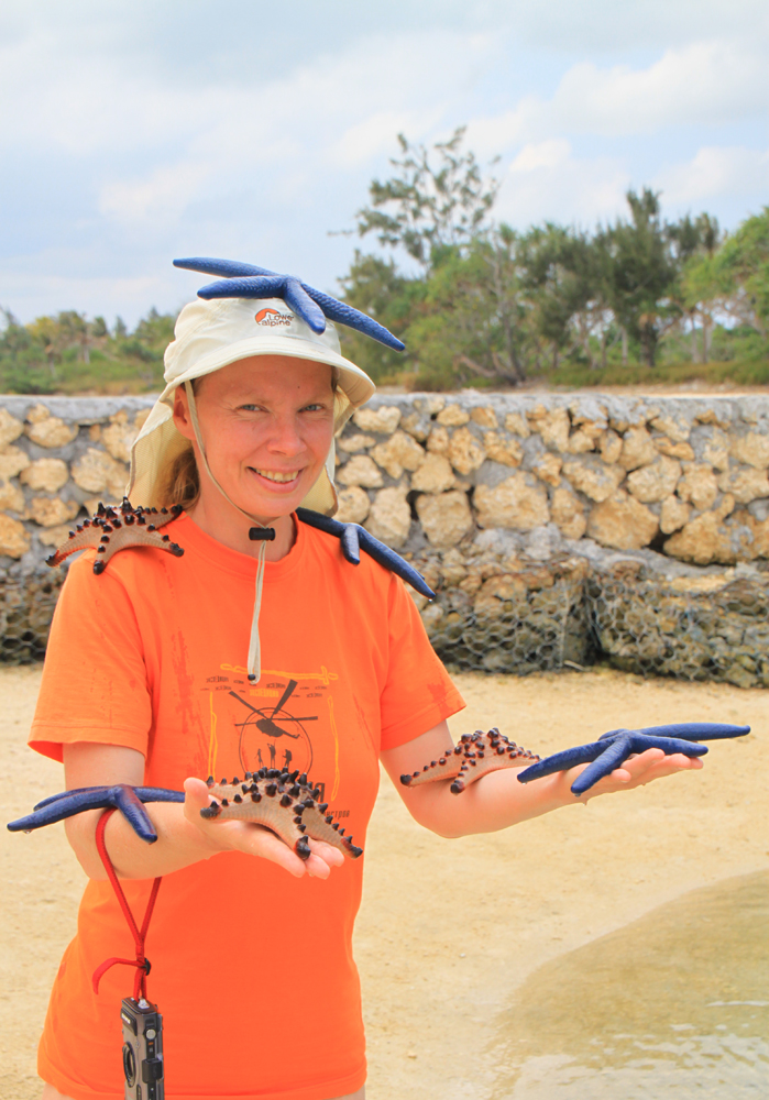 На меня посадили много живых морских звезд. На ощупь они довольно жесткие.