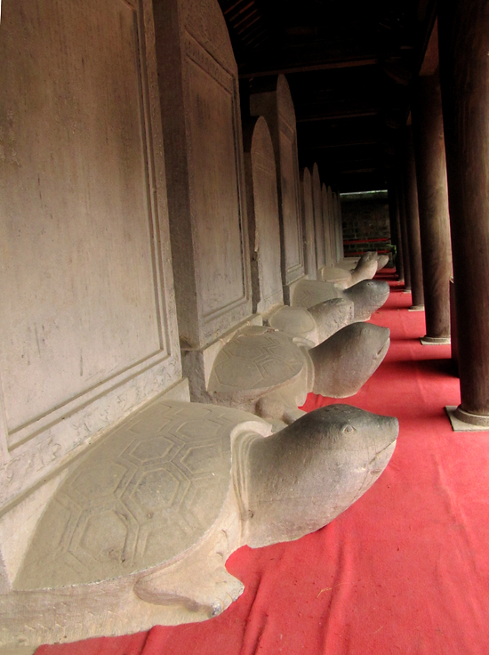 Черепаха во Вьетнаме символизирует мудрость. А конкретно эти каменные черепахи несут на себе не цаплю, но каменные скрижали с именами тех упорных студентов, которые все-таки смогли сдать страшные китайские экзамены. Кроме шуток, многие годами сдавали на то или иное звание чиновника.