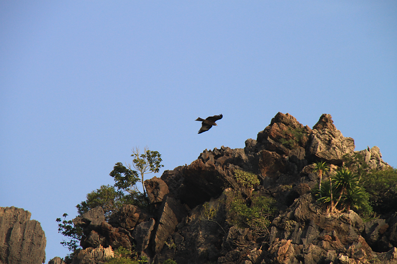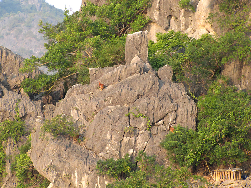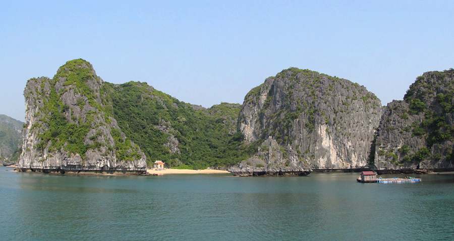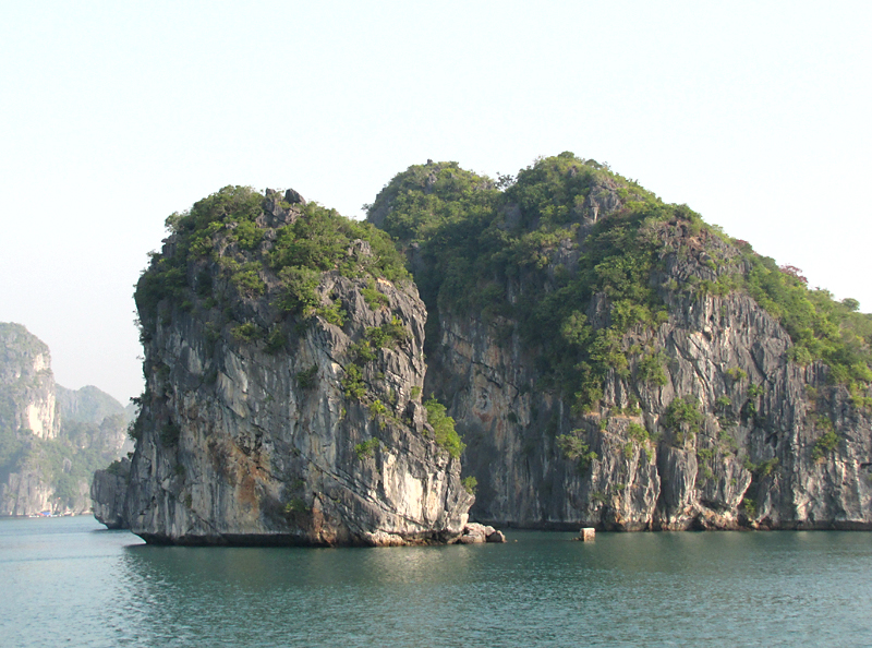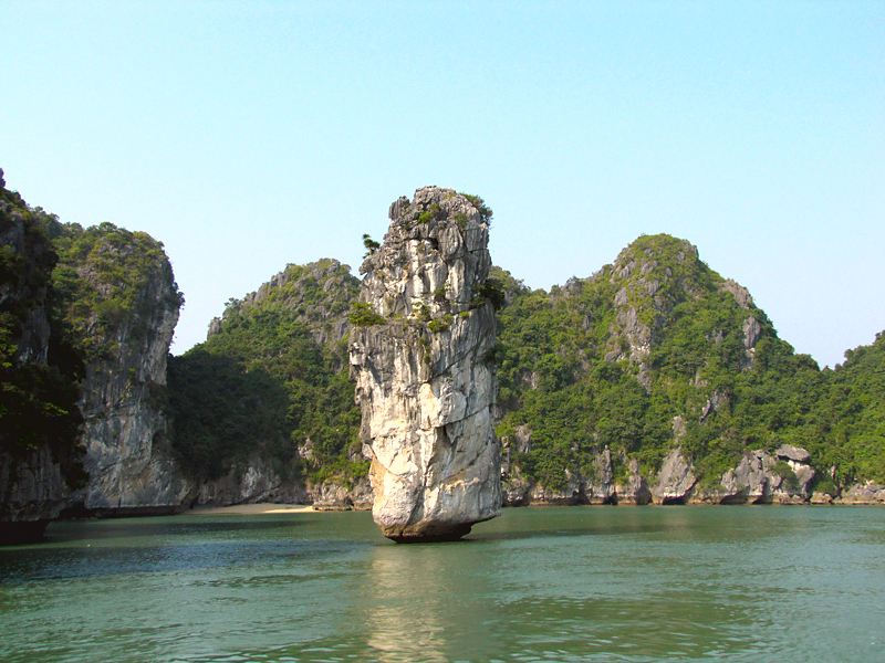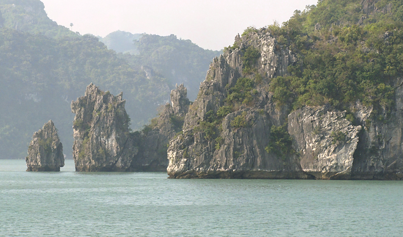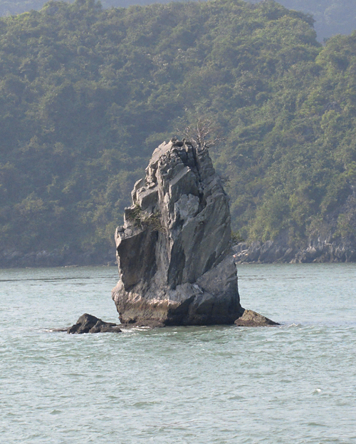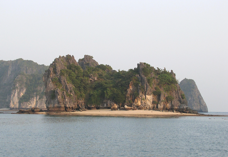На самом острове стоят такие же скалы, как в воде. И вообще, по описаниям получается, что острова бухты Халонг в течение своей истории то уходили основаниями под воду, как сейчас, то оказывались на суше, когда море отступало.