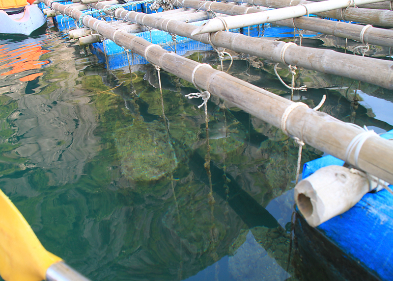 Под бамбуковым каркасом находятся пенопластовые пластины для плавучести, а к ним привязаны тяжелые корзины с устрицами. Люди живут тут же в домике.