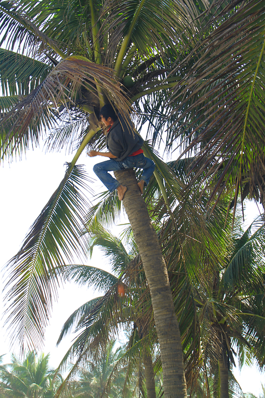 Вслед за ними пришел дядька в форме, кокосы отнял, и, чтобы не пропадали, отдал нам и еще одной вьетнамской паре. А дальше нас учили, как расшибить кокос о ствол пальмы и добыть их него не только сок, но и еду.