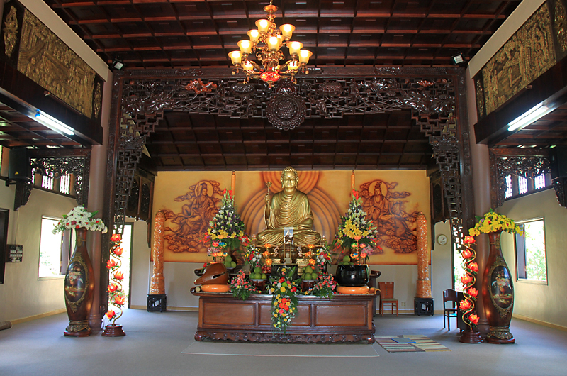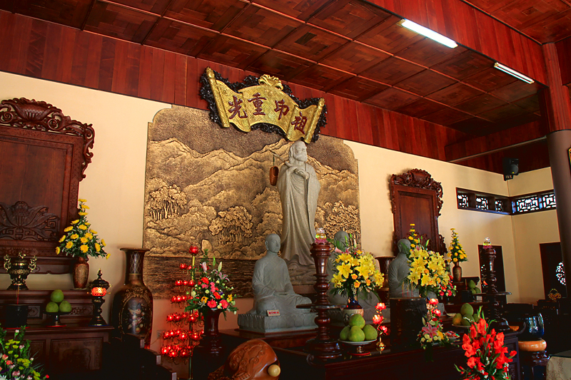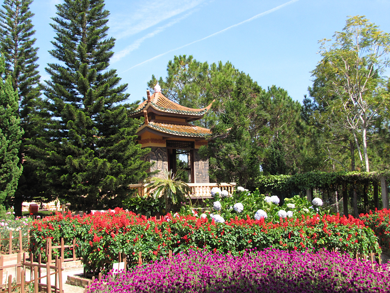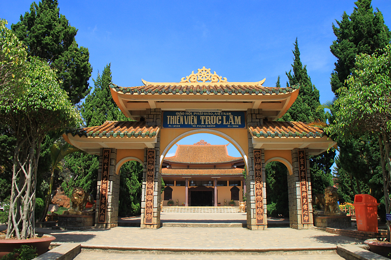 Недалеко от озера на горе находится пагода Truc Lam. Вообще в нее можно попасть по канатной дороге, но днем канатку закрывают (обед для вьетнамцев — это святое) и мы ехали своим ходом.