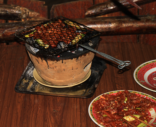 В горшке угли, а сверху кладется решетка. Способ маринования мяса какой-то особый, свинина сладковатая и в ней всякие травы, включая лимонную траву.