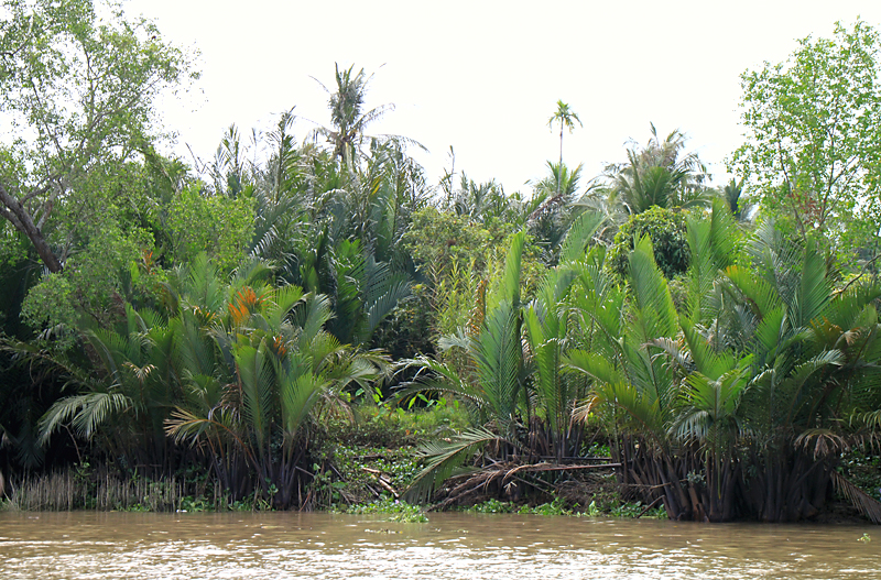 Берега заросли водяным кокосом. Это такое растение, у которого листья похожи на кокосовую пальму, но плоды совсем другие и вообще это не дерево, а куст.