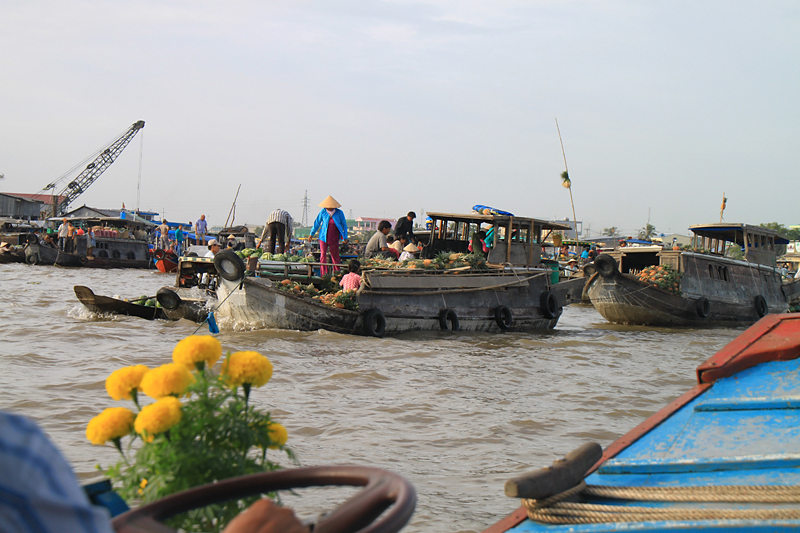 Ближе к вечеру нас погрузили на автобус и повезли в Канто (Can Tho). Это небольшой город, в котором мы ночевали. Вечером мы самостоятельно гуляли по набережной и любовались цветочным базаром, а утром поехали на плавучий рынок.