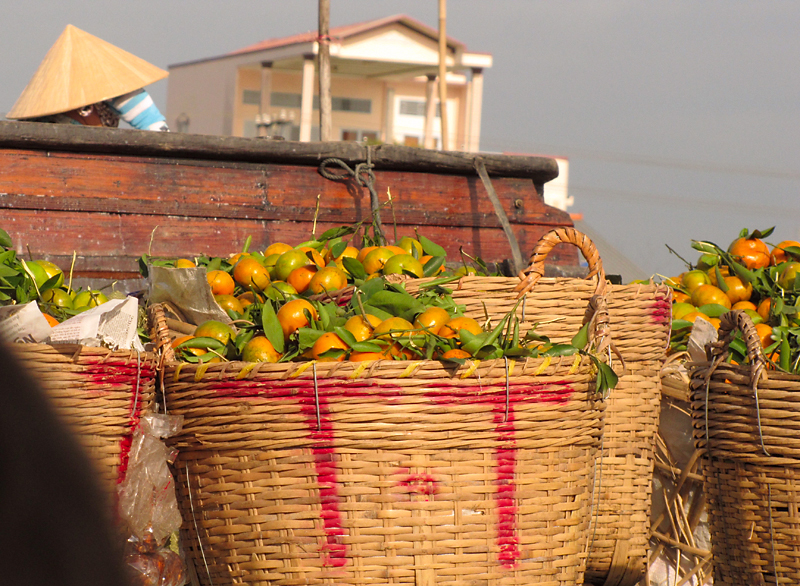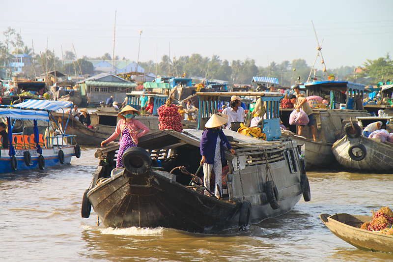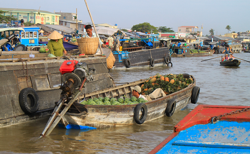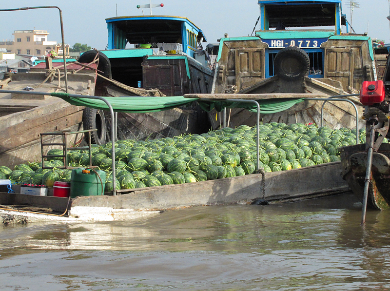 Что приятно — на рынке продают фрукты и овощи, а не китайский ширпотреб. Продавцы торгуют с больших лодок, покупатели приезжают на маленьких лодках за товаром.