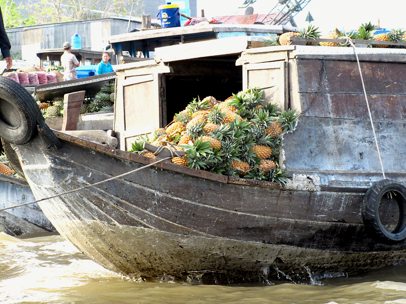 Наш катер причалил к одной из ананасовых лодок и всем желающим выдали по ананасу. Туристическая цена за штуку — 10 кД (0,5$), могу себе представить, сколько они стоят для местных жителей!