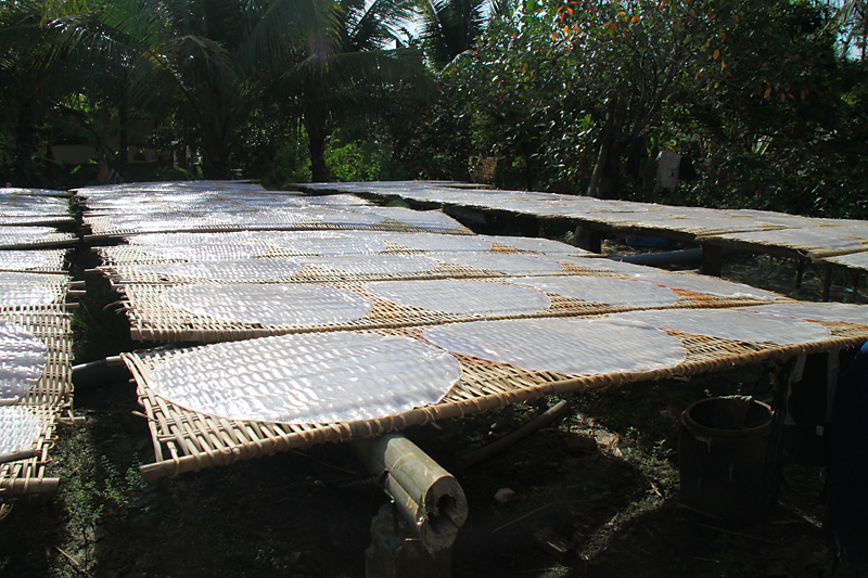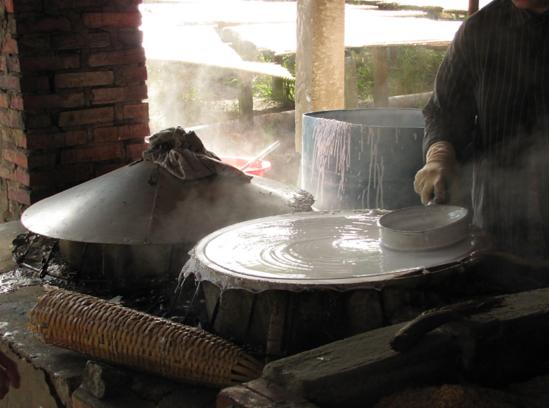 Процесс выглядит следующим образом. Смесь рисовой муки, воды и тапиоки пекут на пару в виде блинов.