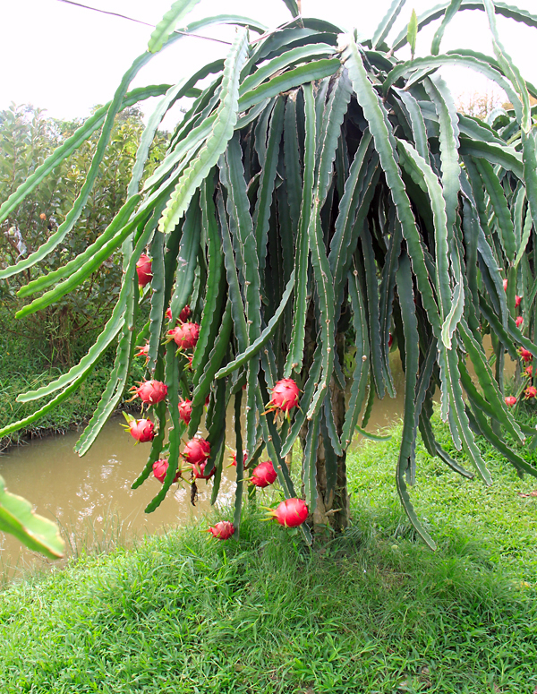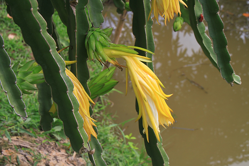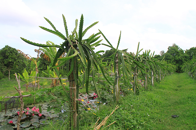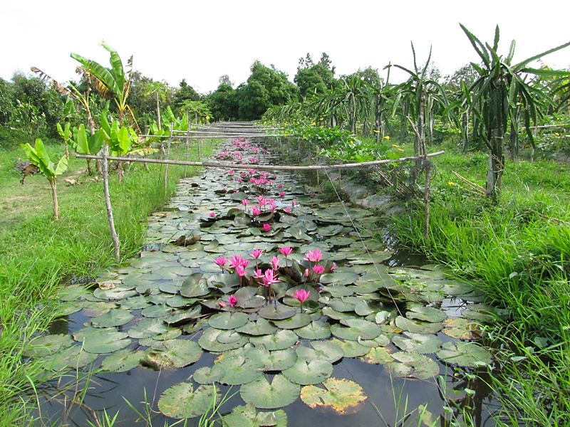 Слева молодые бананы, справа — питахайи, посредине канал с водяными лилиями — нимфеями.