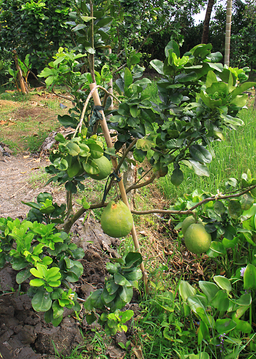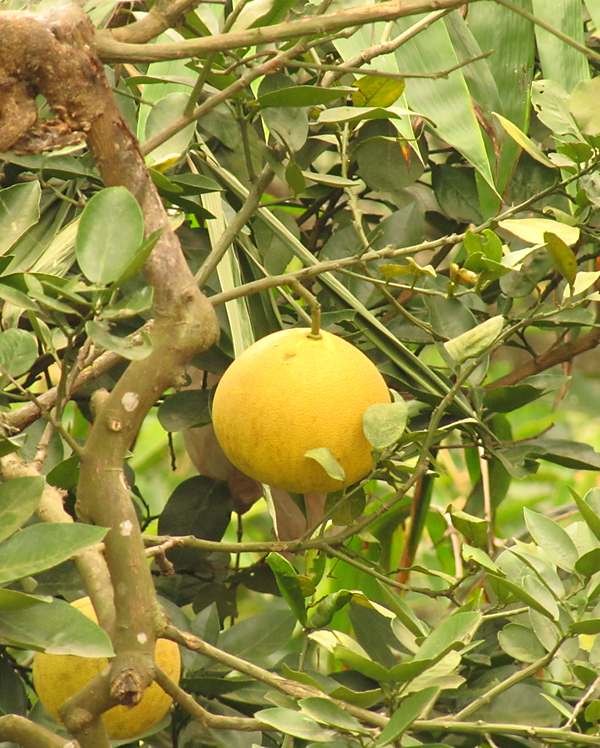 По размеру похож на помело, однако последнее более круглое и без таких бугров.