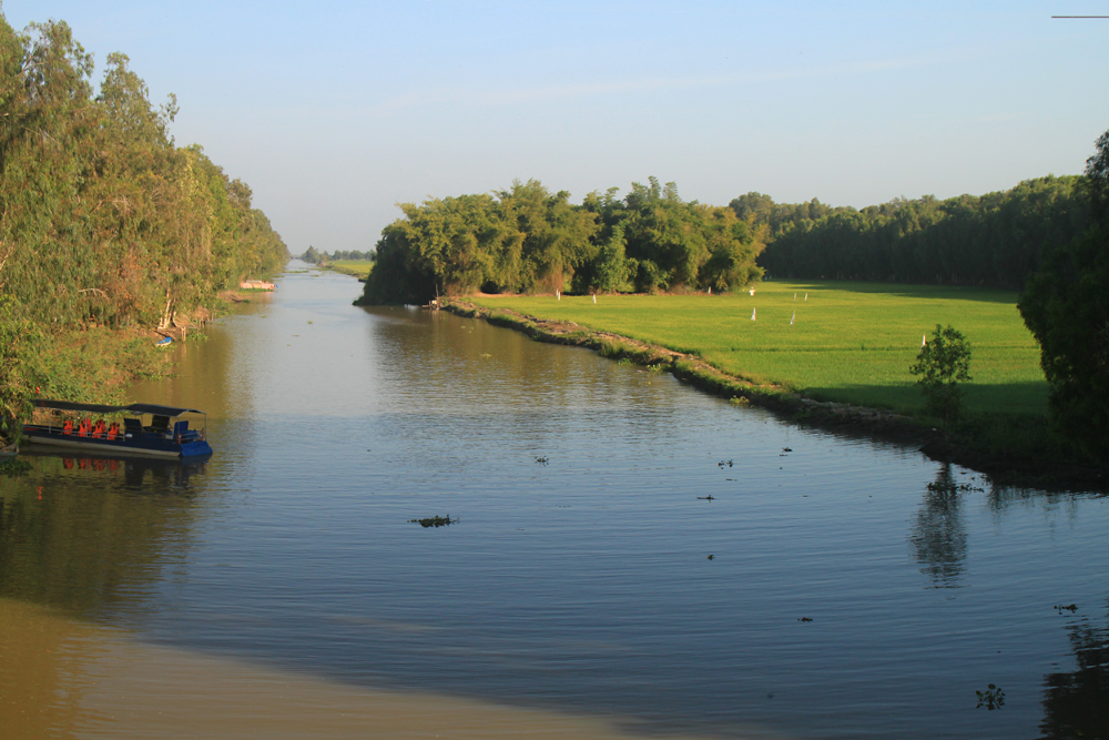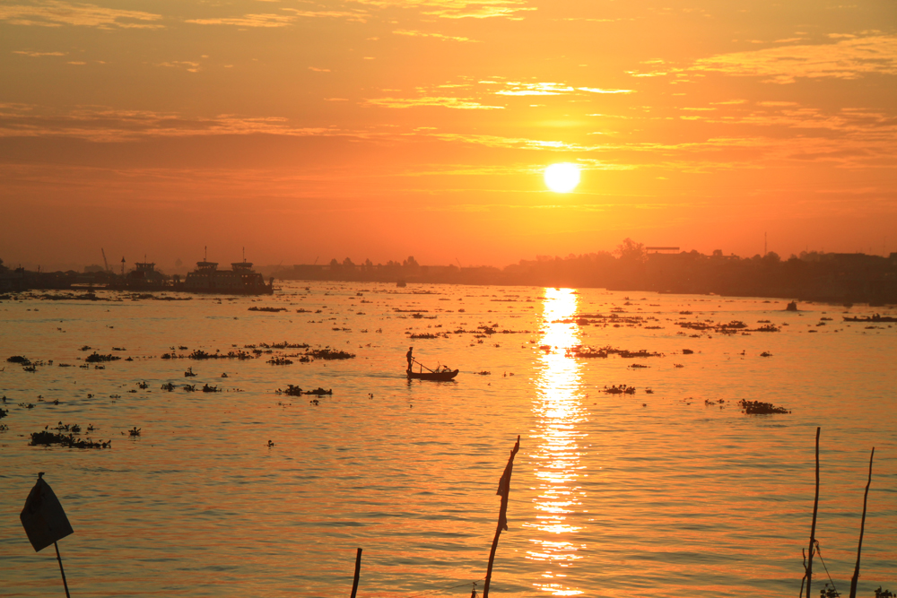 Из Камбоджи во Вьетнам мы добирались на туристическом кораблике по Меконгу. Он ходит из Пномпеня в этот самый Chau Doc (который непонятно как звучит — Тяу Док или Джо Док). Кораблик отплывает в 8:30 и идет около шести часов, стоимость 29$ с человека. Возле границы транспорт меняют на подобный, пересаживая туристов с обеих сторон. Два раза мы причаливали к погранзаставам, все было организовано по-вьетнамски четко и без очередей. Виды по дороге не очень интересные; красиво становится лишь под конец, когда кораблик уходит с Меконга в один из рукавов дельты, и тут уже начинается жизнь на воде.