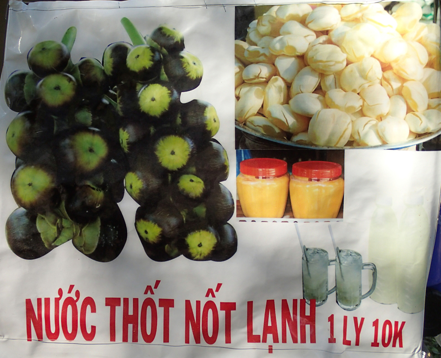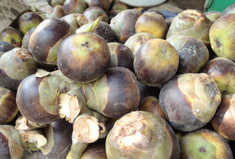 Пока возвращались к своей лодке, заметили новую еду — palm fruit. Фрукт по виду похож на маленький темный кокосовый орех.