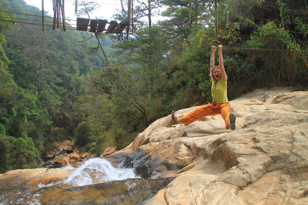 До водопада Понгур от Далата 50 км в один конец. Вниз по серпантину в сторону местного аэропорта и дальше. На серпантине я жалобно пищала и не давала ехать больше 30 км/ч. Вообще обнаружилось кое-что новое: у меня от страха начинаются спазмы сосудов в затылке и вообще в голове. С мотоциклами мы стараемся дело не иметь, но увы: есть места, где без них никуда не попасть. Так что боишься, берешь и едешь.