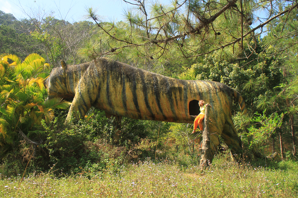 Когда-то в пещере наверху водопада жили тигры, но люди их поубивали. Осталось название, жалостные бетонные скульптуры тигренка и тигрицы с оторванной лапой, да огромный полый тигр для лазания.