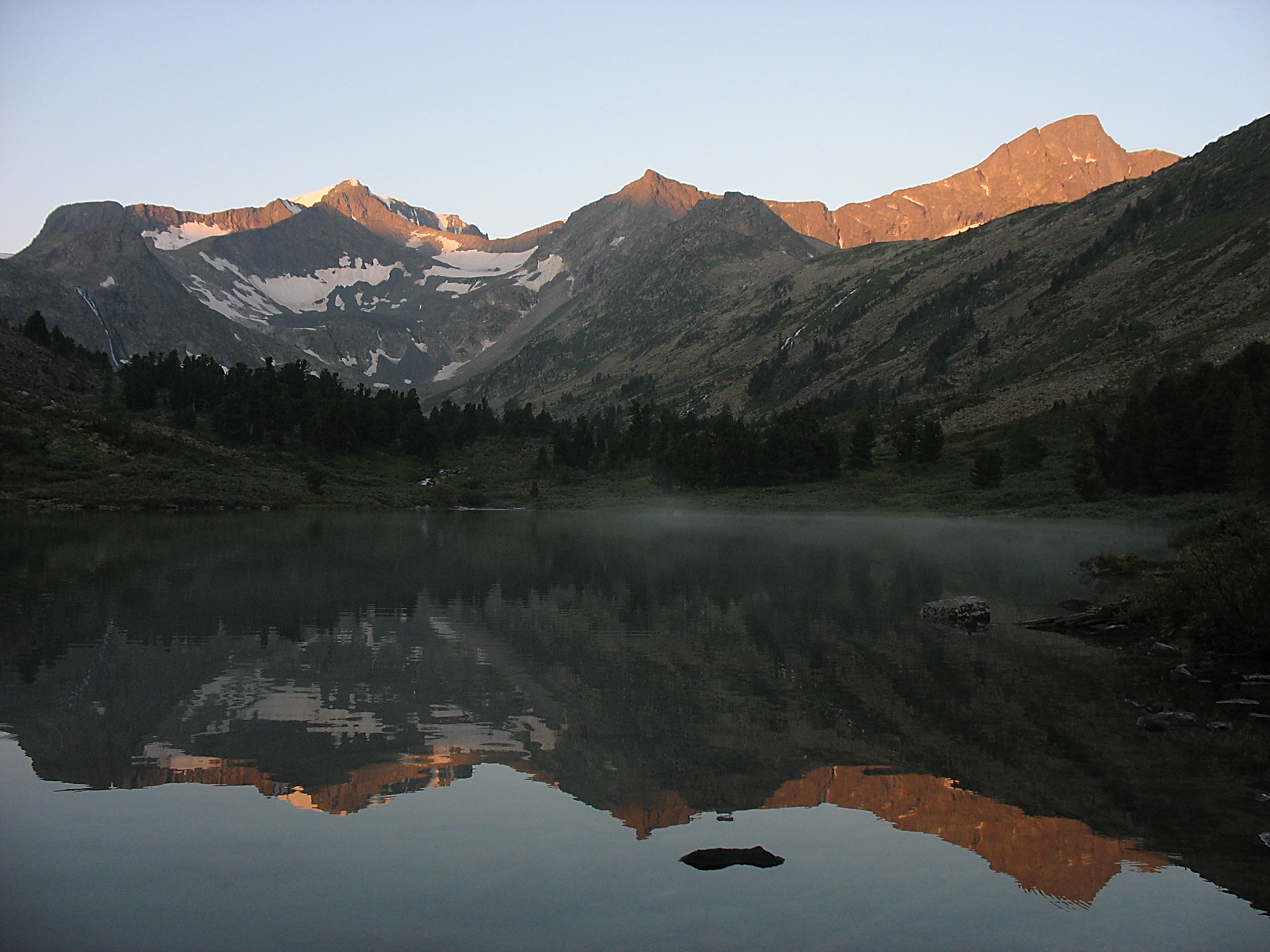 На следующий день перед выходом Ран по гималайской привычке встал на рассвете, чтобы сфотографировать горки у разлива. Ну нет, не Гималаи, конечно, но все равно симпатично получилось: