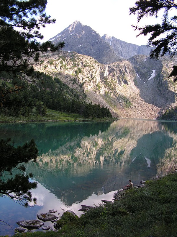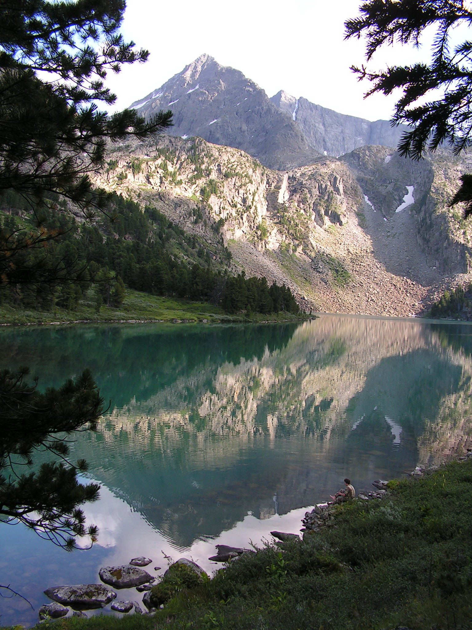 На спуске все очень устали, поэтому до трех часов дня идти даже налегке сил не было. Потом стоящие на ногах пошли гулять к озеру. Вообще силы и способности у участников были очень разные. Я обычно находилась где-то между теми, кто умер весь и больше ничего не может и теми, кто бодро скачет несмотря ни на всё. Это приводило к тому, что на радиальных выходах до конечной точки маршрута мы с Раном не доходили, а останавливались где-то посредине придти в себя и пообщаться с местом. Очень правильно сделали и на сей раз - народ побежал на одно из верхних озер, а мы сидели на берегу большого, а оно стоит того, чтобы посидеть там спокойно и в одиночестве.