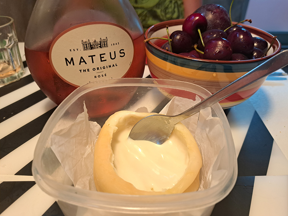 Очень симпатичный розовый портвейн (вы знали, что портвейны бывают розовыми?), сыр был какой-то проходной. На переднем плане паштель де ната. Эти корзиночки — традиционная португальская выпечка с яично-сливочным заварным кремом.