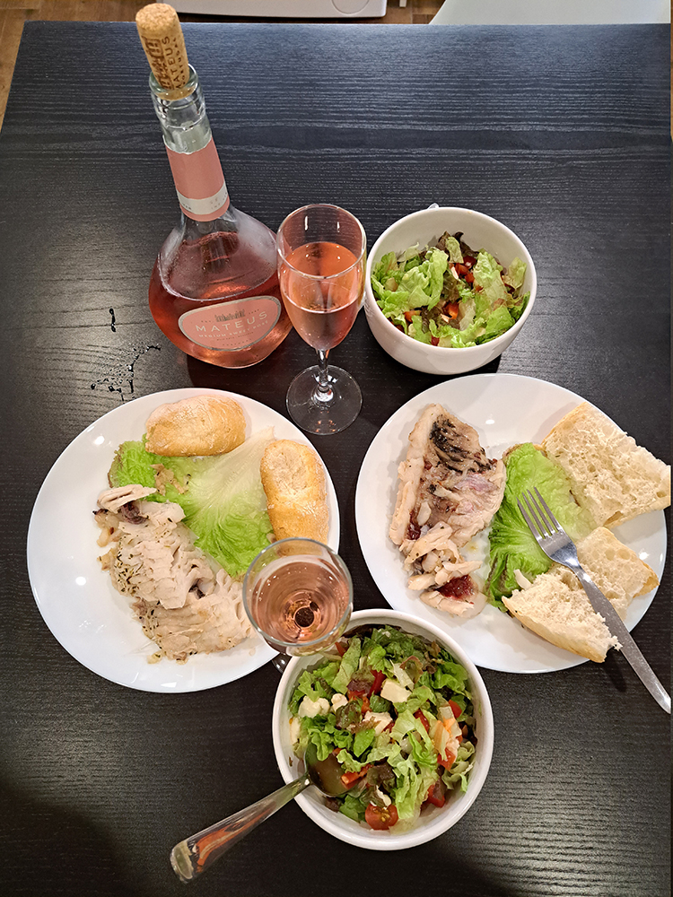 Креветки, моцарелла и свежевыжатый сок пойдут на ужин, а хлеб и мясо составляли наш обеденный перекус. Завтракали мы по большей части творогом, потому что могли его найти. Ведь не в каждой стране это возможно, а мы творог любим. На обед, который всегда был в дороге, мы ели фрукты и хлеб с мясом (нарезкой или честно пожаренным куском мяса накануне). А ужин был полноценный, с основным блюдом, салатом, сыром и вином. А потом с чаем и выпечкой.