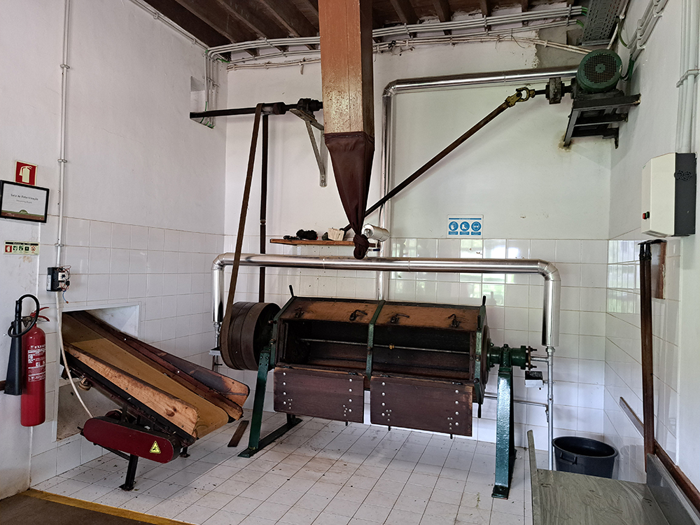 Сушильный аппарат. Сверху по трубе подается горячий воздух, барабаны должны вращаться для равномерного завяливания чайных листьев.