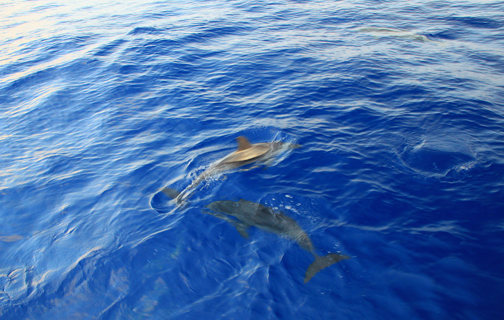 Видели большую стаю дельфинов, с белыми пузами, они ныряли под носом лодки, мы даже движок приглушили на всякий случай.