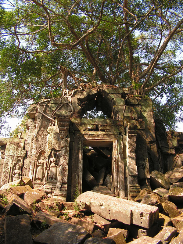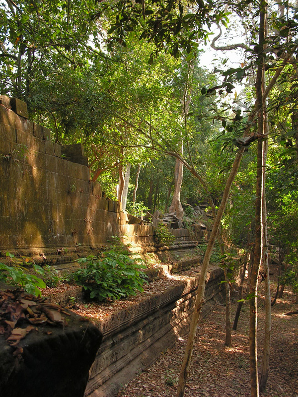 В 15 веке кхмерское государство (или королевство) ослабло и под натиском соседей-тайцев сдало Ангкор, переехав на восток. О храмах не то чтобы забыли, там жили немногочисленные буддийские монахи. Но многое порушили люди, да и лес постарался. Деревянных домиков для подданных не осталось, а вот каменные храмы и бассейны с водой частично сохранились.
