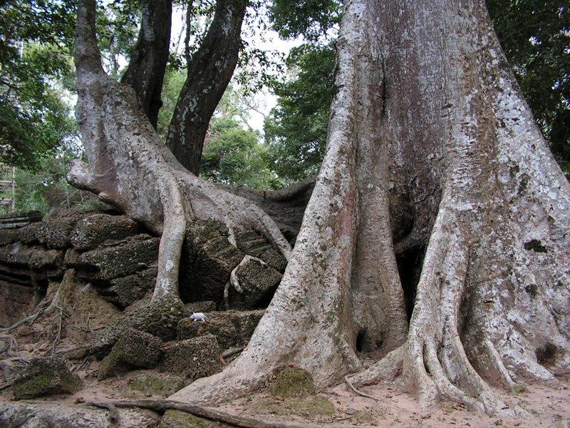 В Ангкор Томе я впервые встретилась с огромными деревьями. Чтобы хоть как-то сфотографировать одно из них, легла на землю. Все равно масштаб не передается. Вдруг получилось передать ощущение?