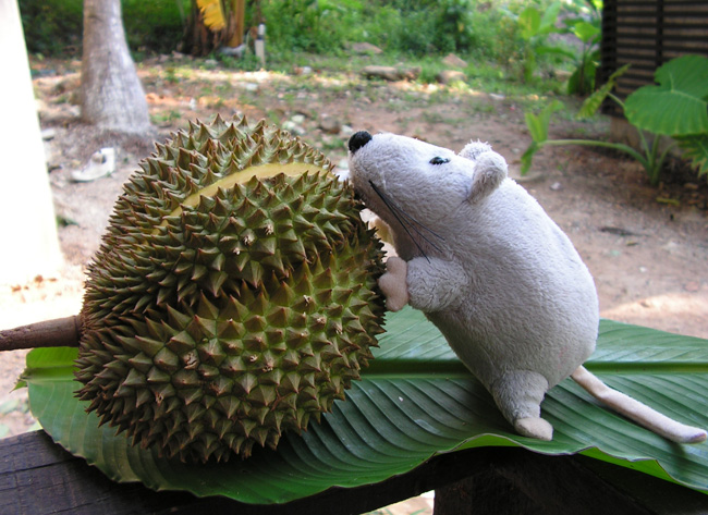 На фотографии - дуриан-малютка, они бывают размером с хороший арбуз. И очень колючие. У дуриана одиозная репутация, на мой вкус, необоснованно раздутая. Это уже еда, а не фрукт. По консистенции содержимое желтых долек напоминает крем, на вкус он сладкий. А вот запах уже не фрукта и не десерта, а какого-то второго блюда. Послевкусие говорит тебе, что ты ел мясной гуляш, возможно, с луком. Дуриан очень быстро портится, будучи вскрыт. А продают его только во вскрытом, а иногда и в очищенном виде. зная об этом, я покупала только те дурианы, которые имели здоровый зеленый цвет и были вскрыты при мне. Короче, дуриан - это не фрукт, а скорее, пищевой цирк, который мне понравился.