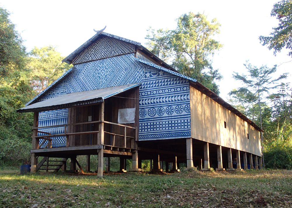 Это общинный дом, расписанный типичным узором. Спереди висел замок, а сзади было открыто. Внутри дома пусто, тут собираются на важные деревенские посиделки