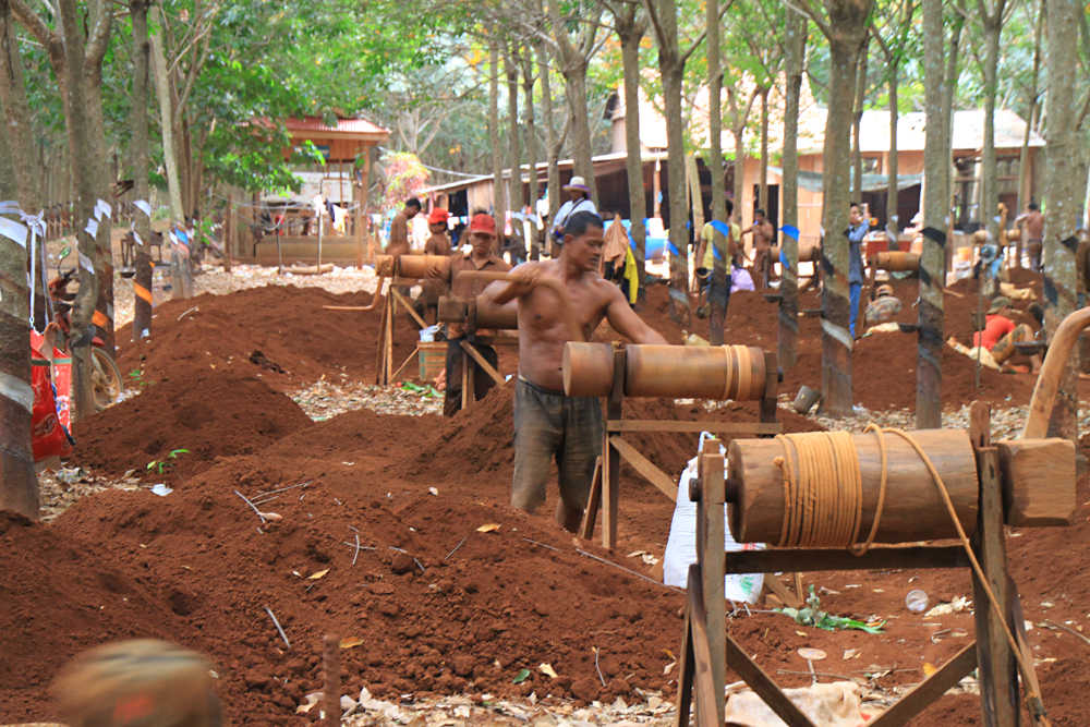 А дальше мы поехали на шахты драгоценных камней, это как раз в сторону Йик Лом и километров 25–30 дальше. Шахты переезжают с места на место, нас привезли прямо на каучуковую плантацию, где скважины копают прямо между деревьев. Место колоритное.