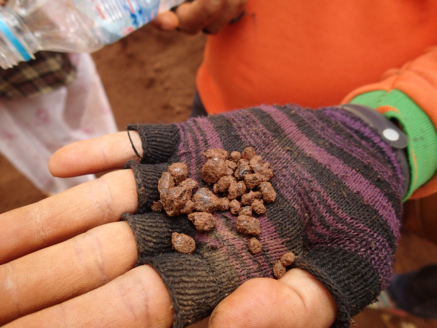 В земле делают колодцы 12 метров глубиной, вынимают снизу землю, а потом все садятся и перебирают отвал.