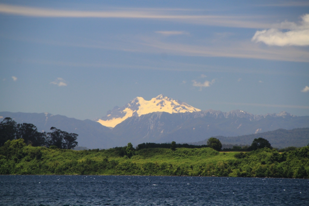 Пока мы ехали к Пуэрто Варасу, облака разошлись. На фоне озера Льянкауэ вулканы смотрятся очень эффектно.