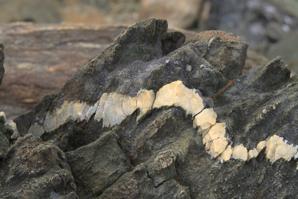 Прибой довольно сильный, вода с серым отливом, а вот камни интересные.