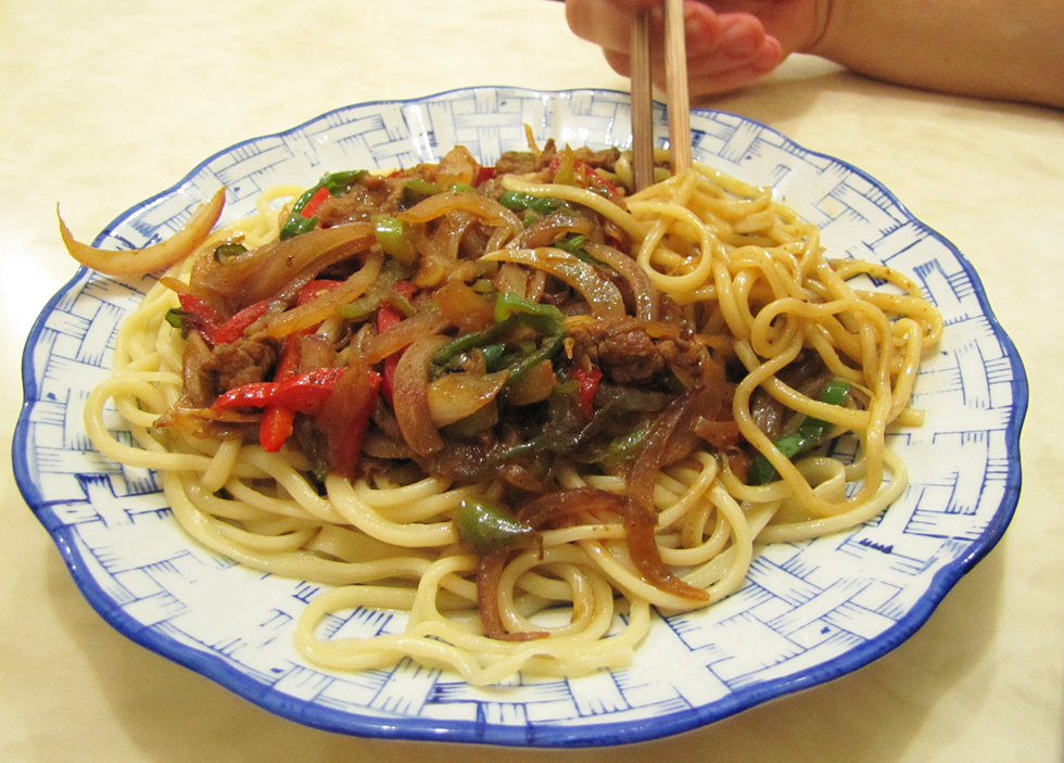 Эту лапшу на глазах у будущих едоков вытягивают из куска теста, очень колоритно получается. Наполнитель можно заказать разный, но в основном мясо с овощами.