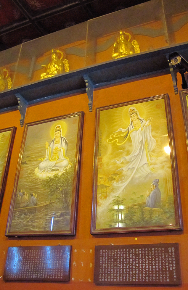 Вот, например: боддхисаттва Авалокитешвара в китайской традиции изображается богиней милосердия Гуаньинь. А тут какой-то переходный этап — статуя изображает Авалокитешвару, а изображения на стенах — Гуаньинь.