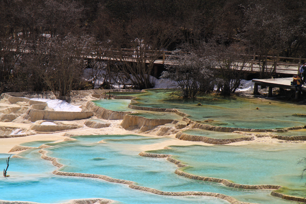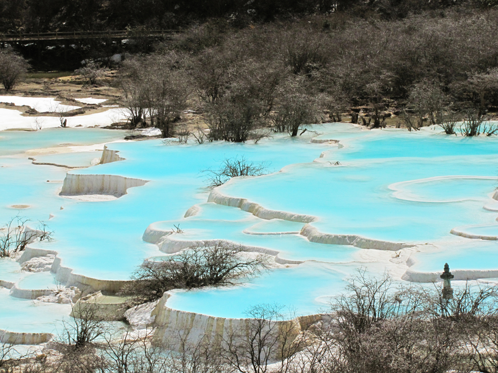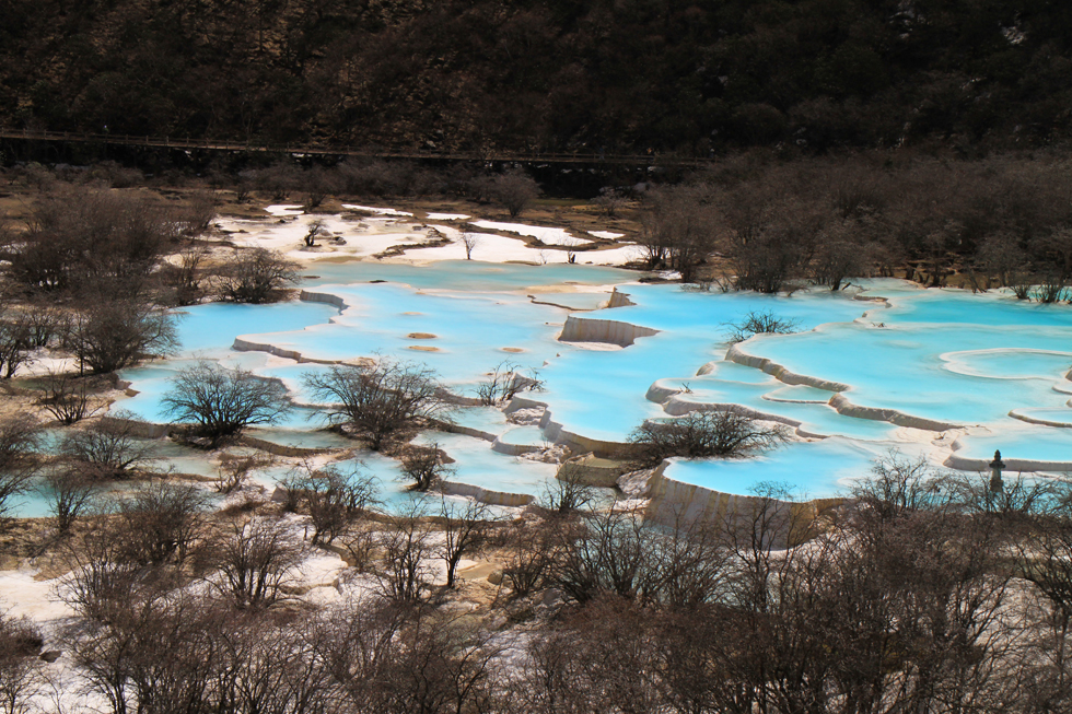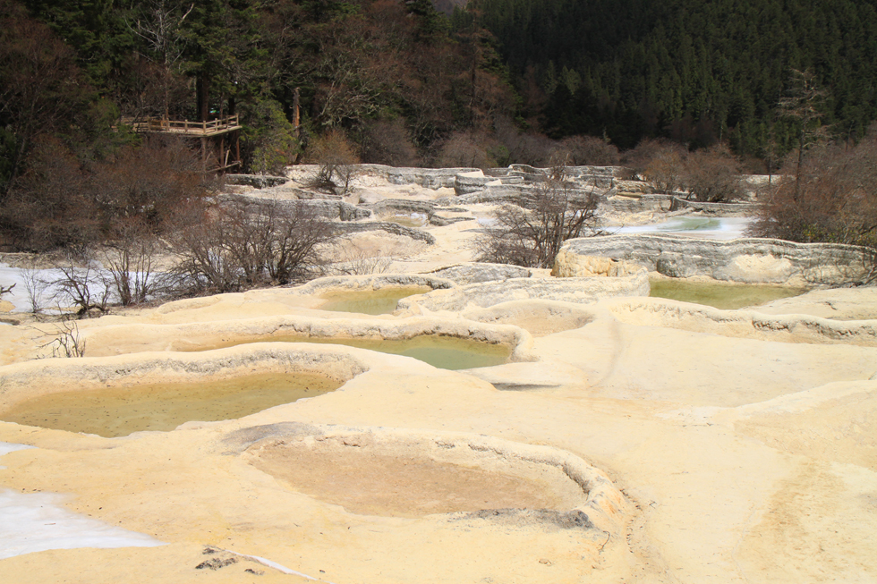 Вдалеке видны пустые травертиновые ванны, они все бледно-желтого цвета. Сверху река, наверное, выглядит как чешуйчатый дракон, поэтому долина называется Хуанлун, Желтый дракон.