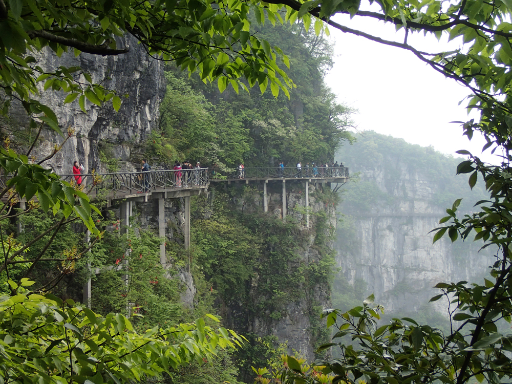 Ты платишь дополнительные пять юаней, на тебя одевают мягкие красные тапочки — и вперед. Многие очень боятся этой дорожки и не могут идти по стеклу. Слева есть каменный карниз сантиметров в 20 шириной, и вот народ к нему прилипает. А мне лишь бы руками было за что схватиться, а так совсем не страшно. Я же понимаю, что остальные дорожки на этой горе так же висят в воздухе на искусственных опорах, как и эта. Ну и что, что вместо камня — стекло...
