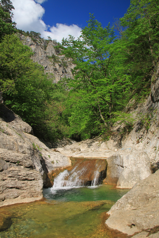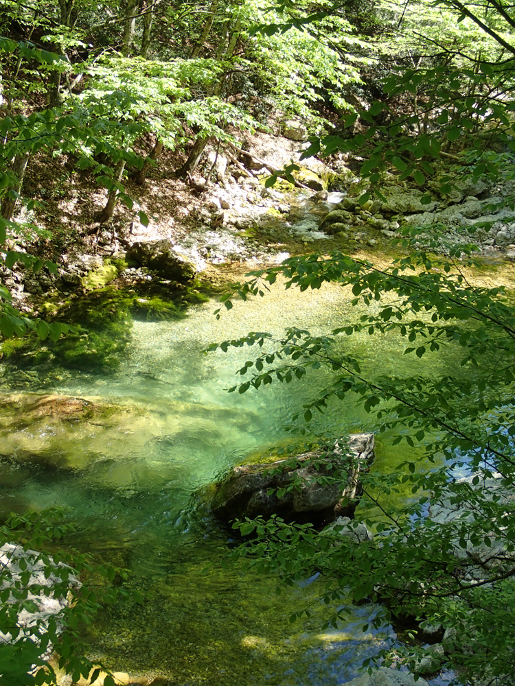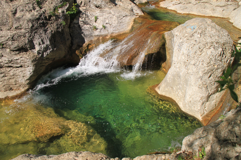Тропинка спускается в каньон возле Голубого озера, а потом идет дальше вверх. Но нам захотелось пройти по каньону до Ванны Молодости, а потом выйти обратно. Мы надеялись забраться в каком-то другом месте на стену каньона, но это сложновато с рюкзаками. Оттого вместо расчетных девяти километров мы вечером насчитали 12.