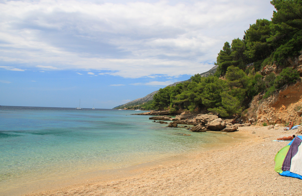 Пляж Златни Рат очень красивый — вот это сочетание сосен, светлой гальки и чистейшей, но пока холодной воды (около +18). Никакого песка, в Адриатике все пляжи либо галечные, либо из каменных плит. А издалека казалось, что песок.