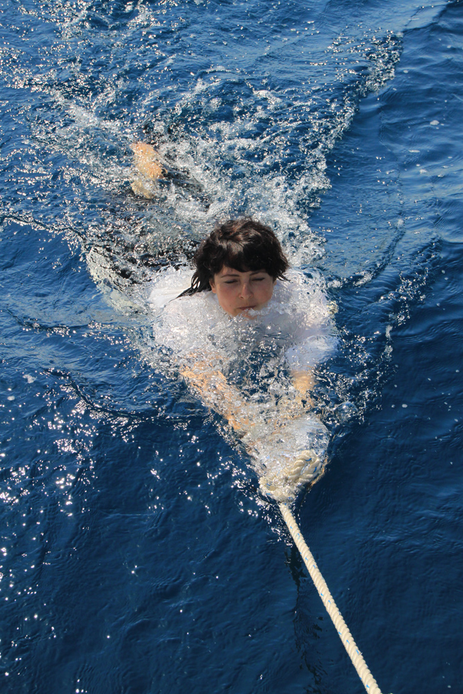 Сами некоторое время боялись так купаться под парусом, вдруг нужно резко делать галс? Но потом тоже осмелели. На моторе надежней, но мотор воняет там внизу, не так романтично получается.