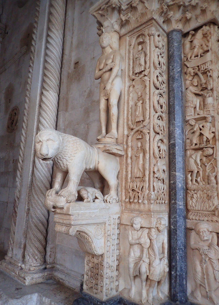 Каменная резьба вокруг входа в католический собор — Адам и Ева.