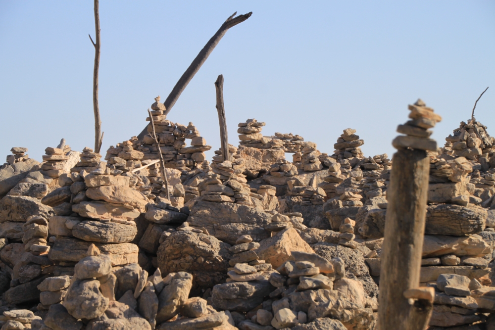 Обошли соленое озеро Мир и посмотрели на перешеек, соединяющий его с морем. На перешейке посетители построили множество пирамидок.
